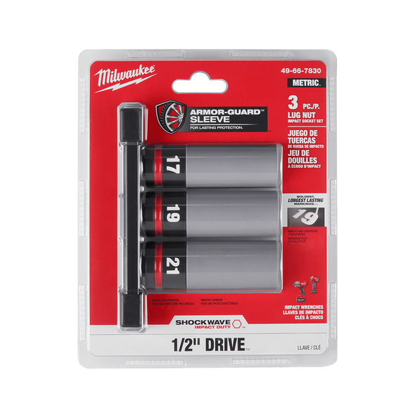The MILWAUKEE® SHOCKWAVE Impact Duty™ 1/2" Drive 6 Point Lug Nut Wheel Sockets feature a durable, nonmarring sleeve to protect rims during tire changes. The ARMOR-GUARD™ Sleeve is made with premium, durable plastic for lasting protection against cracking or shredding during wheel installation and removals. The lug nut sockets are thin-walled for easy access in tight wheel assemblies and feature a non-marring plastic insert to protect lug nuts during use, along with our stamped & ink filled sizes for bold, long lasting markings. Our sockets are engineered with high strength forged steel for optimised performance in heavy-duty applications. The dual-hole design and ring groove allow for easy socket attachment and removal. MILWAUKEE® SHOCKWAVE Impact Duty™ Lug Nut Wheel Sockets are optimised for use with 1/2" drive impact wrenches, drivers, ratchets, and adapters and meet ASME industry standards for thin-walled sockets.