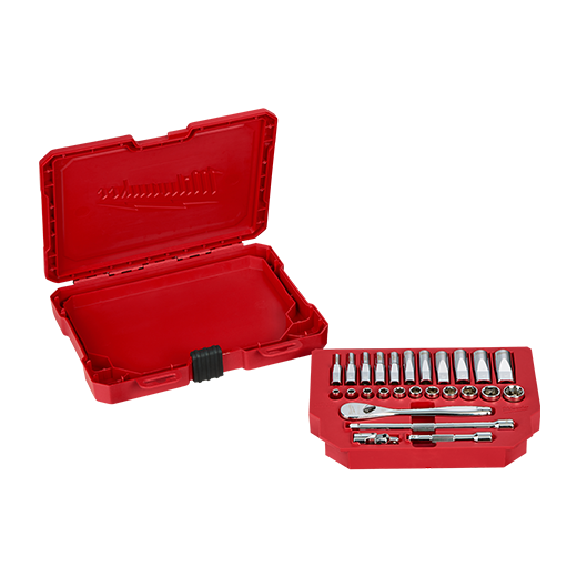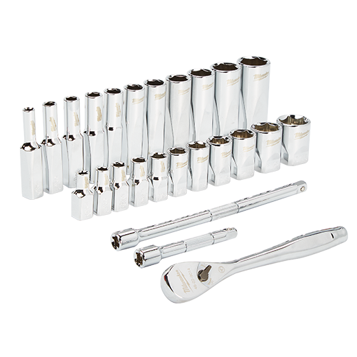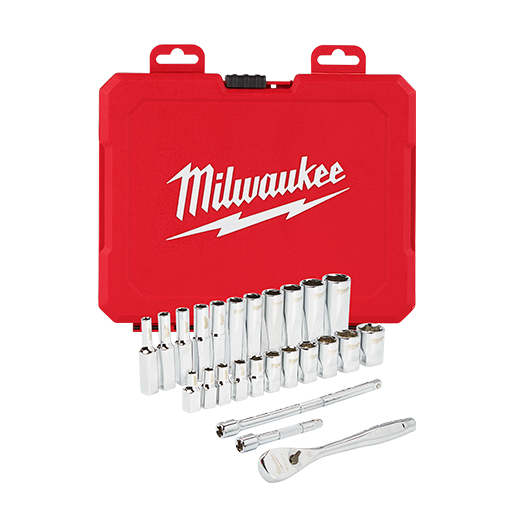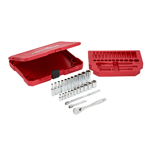 Our MILWAUKEE® SAE 26 piece 1/4" drive Ratchet & Socket set is designed from the ground up, offering our users the Most Versatile Sockets that are Anti-Roll and Wrench-Ready. Its innovative FOUR FLAT™ Sides feature an anti-roll and wrench-ready design. The 90 tooth ratchet tool offers 4° of arc swing and a slim profile design, allowing you to work in tighter and more confined spaces, be it under the hood of a car or in the middle of a remodel. The ratchet and socket kit comes with a removable inner tray which is perfectly designed to be stored long-term in a steel storage chest. All of our sockets are stamped with SAE measurements on the flat side for easy-to-read visibility. It also comes with a durable carrying case for ultimate portability. The set comes with accessories included so that our users can get every job done, both in the garage and on the jobsite. Our ratchet and socket set is backed by our Lifetime Guarantee.