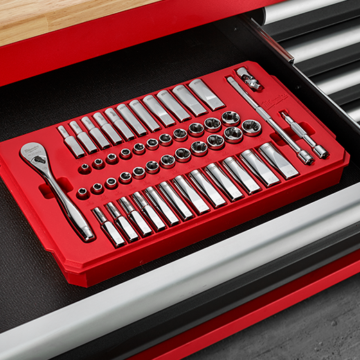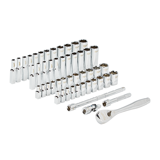 Our MILWAUKEE® SAE & Metric 50 piece 1/4" drive Ratchet & Socket set is designed from the ground up, offering our users the Most Versatile Sockets that are Anti-Roll and Wrench-Ready. Its innovative FOUR FLAT™ Sides feature an anti-roll and wrench-ready design. The 90 tooth ratchet tool offers 4° of arc swing and a slim profile design, allowing you to work in tighter and more confined spaces, be it under the hood of a car or in the middle of a remodel. The ratchet and socket kit comes with a removable inner tray which is perfectly designed to be stored long-term in a steel storage chest. All of our sockets are stamped with SAE and metric measurements on the flat side for easy-to-read visibility. It also comes with a durable carrying case for ultimate portability. The set comes with accessories included so that our users can get every job done, both in the garage and on the jobsite. Our ratchet and socket set is backed by our Lifetime Guarantee.