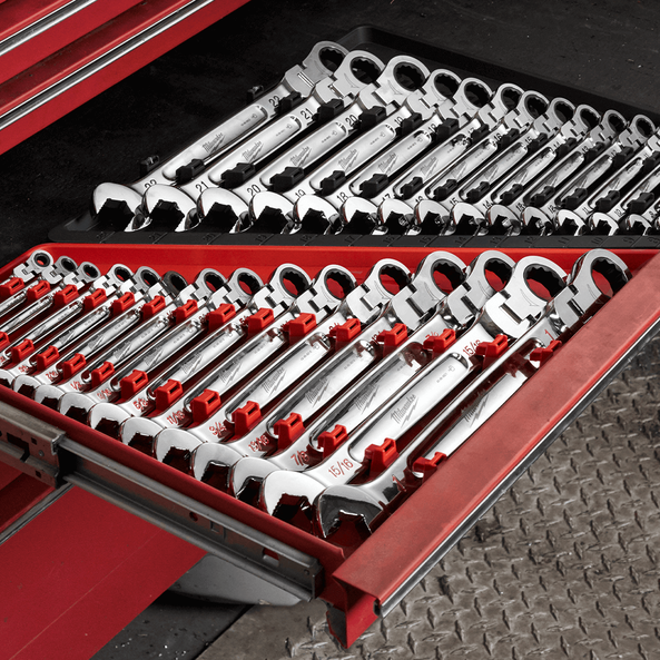 Our Flex Head Ratcheting Combination Wrenches feature a market leading 2.5° of arc swing, and alongside the flex-head, allows our users to work quickly and efficiently tight spaces. With durable double-stacked pawls in the ratcheting mechanism we offer a long ratchet life and improved access with 144 ratcheting positions. MAX BITE Open-End Grip improves the ratchet wrench's grip on nuts and bolts, offering 25% more torque than smoth-faced wrenches and preventing rounding of the fastnener. Each combination wrench features a comfortable I-Beam handle design for improved ergonomics. Our ratcheting combination wrench set features ink-filled size labels for easy size identification, as well as quick distiction between SAE and metric sets. We stand behind our products, offering a Lifetime Guarantee on all of our combination ratchet wrench sets.
