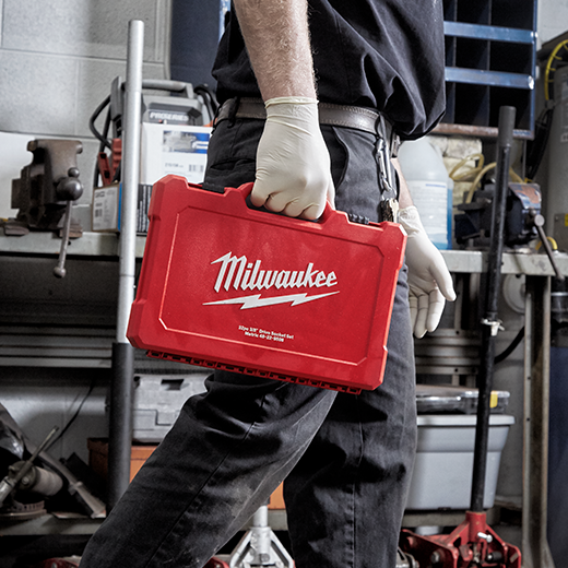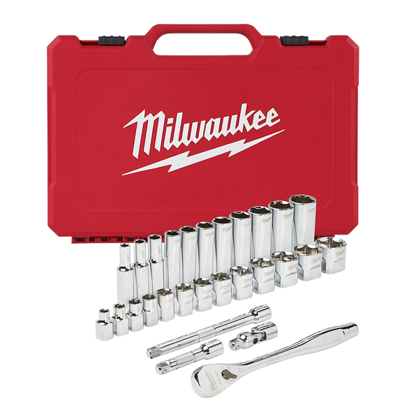 Our MILWAUKEE® SAE 32 piece 3/8" drive Ratchet & Socket set is designed from the ground up, offering our users the Most Versatile Sockets that are Anti-Roll and Wrench-Ready. Its innovative FOUR FLAT™ Sides feature an anti-roll and wrench-ready design. The 90 tooth ratchet tool offers 4° of arc swing and a slim profile design, allowing you to work in tighter and more confined spaces, be it under the hood of a car or in the middle of a remodel. The ratchet and socket kit comes with a removable inner tray which is perfectly designed to be stored long-term in a steel storage chest. All of our sockets are stamped with metric measurements on the flat side for easy-to-read visibility. The set comes with accessories included so that our users can get every job done, both in the garage and on the jobsite. Our ratchet and socket set is backed by our Lifetime Guarantee.