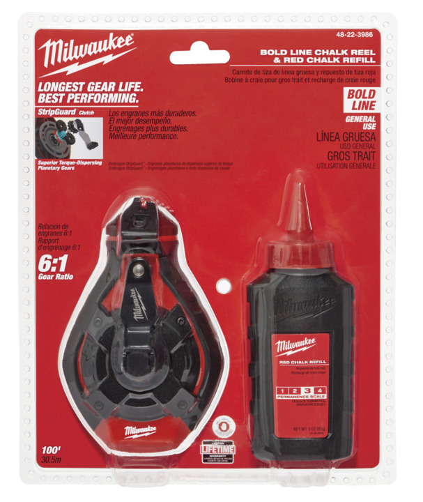 Milwaukee chalk reels provide users with the most durable and best performing chalk reels on the market today. Featuring exclusive StripGuard clutch combined with power tool inspired planetary gear system, providing the longest gear life in chalk reels. For added productively, Milwaukee chalk reels features fast retraction ratio of 6:1. High strength braided bold line creates clear, bold lines and resist abrasion from tough jobsite conditions.