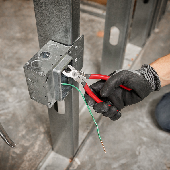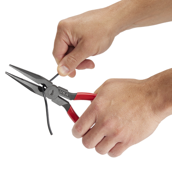 Our Milwaukee® USA Made Dipped Grip 203mm (8") Long Nose Pliers provide professionals with a tool that delivers the best grip and easiest cuts. Our needle nose pliers feature cross-hatched, laser-hardened teeth for maximum grip when pulling or twisting. The optimised pivot point is designed to give the best leverage during tough cuts. Our long-nose pliers are engineered to deliver the smoothest open and close experience from the start, with no break-in period required. For additional versatility, our pliers feature a reaming head for 12.7mm (½") to 25.4mm (1") conduit and a fish tape puller and are tether ready. Our Milwaukee Long Nose Pliers are made in USA with best-in-class manufacturing technology and USA-sourced materials, including durable, press-forged steel, and are backed by a complete Lifetime Guarantee.