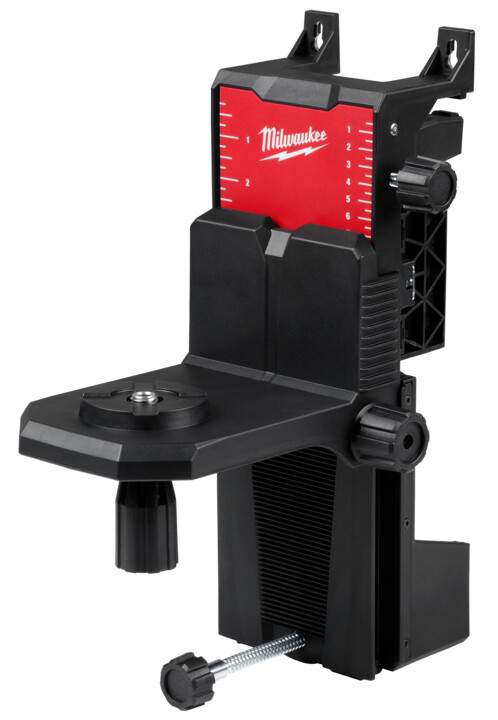 This Wall Mount features a precise vertical adjustment that makes aligning horizontal lines quicker. The Rotary Laser Wall Mount also features an integrated screw and nail hang hole to mount on different materials. The Rotary Laser Wall Mount is equipped with a 5/8”- 11 mounting thread and is compatible with all MILWAUKEE® Rotary Lasers.