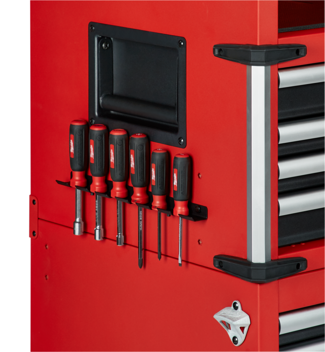 The chest lid has 266mm (10.5") clearance and a thick top mat with a MILWAUKEE-embossed logo. The extensive list of features includes an integrated peg wall in the chest, paper towel holder, two J-hooks to store your hoses and cords, and stylish aluminium edge guards with rubber corner bumpers to help protect your investment.
