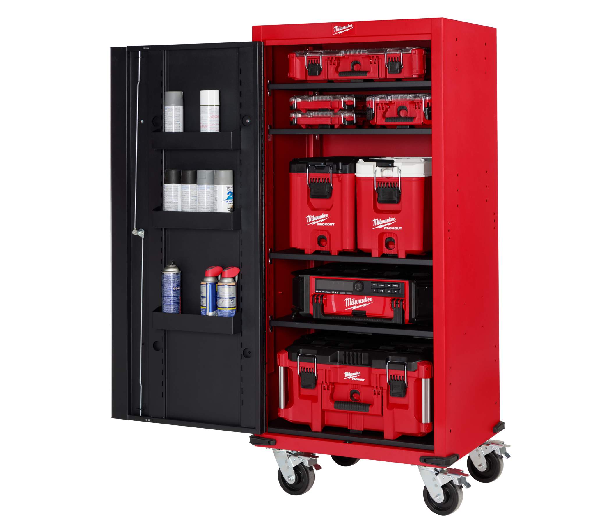 It can be secured to either the left or right side of your existing Milwaukee storage by flipping the locker door, while the interior space with its adaptable shelves has been designed to fit PACKOUT™ System solutions, including our PACKOUT™ Rolling Tool Box.