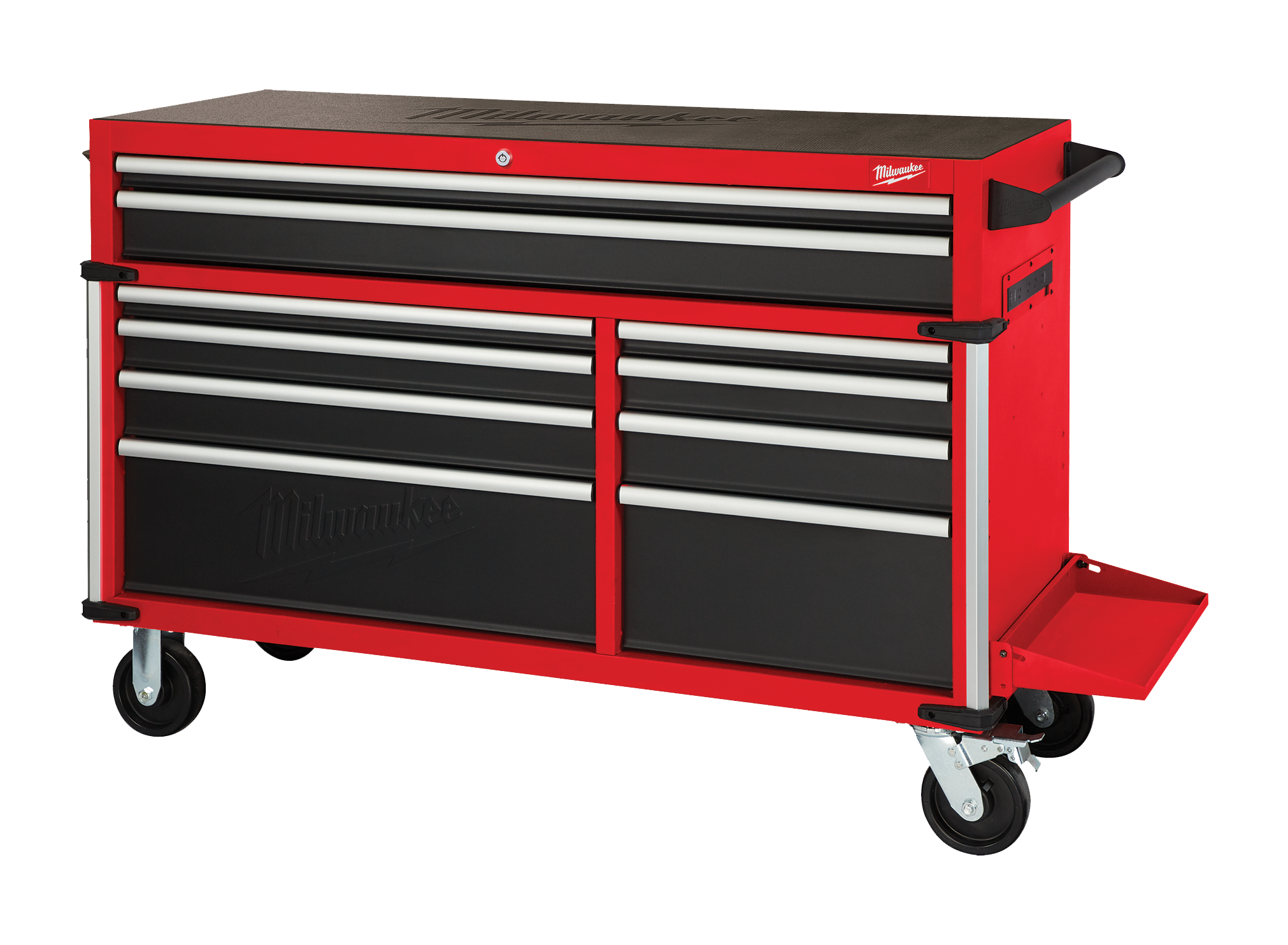The next generation of Milwaukee high capacity steel tool storage is here. The 10-drawer trolley is an extra-deep 558mm (22"), which is 101mm (4") deeper than most other units. Featuring a reinforced angle iron frame, the 45kg rated soft-close ball bearing drawer slides gently retain the drawers from accidental opening or slamming shut, 5" industrial casters and stylish aluminium edge guards with rubber corner bumpers to help protect your investment.