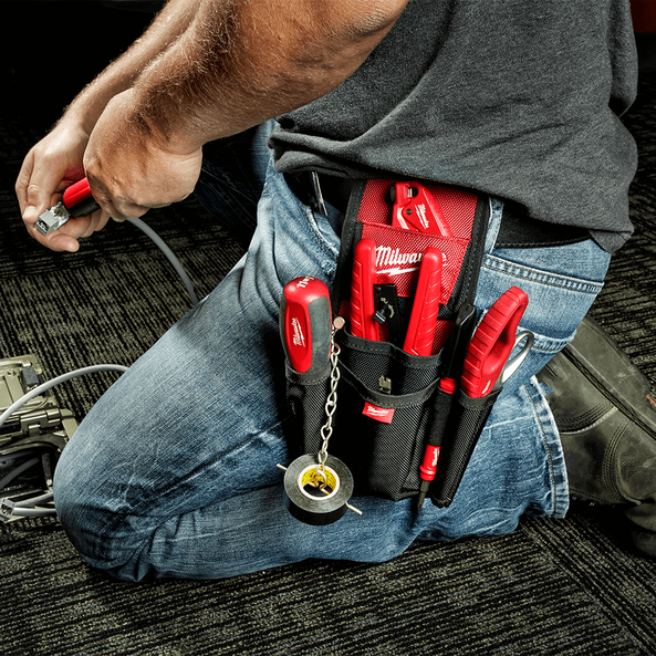 The Compact Utility Pouch features a 1680D ballistic material construction, which provides up to 5x longer life and riveted seams resulting in a Pouch that is up to 4x stronger. The Milwaukee Compact Utility Pouch also features a quick attach belt loop that is designed to allow the pouch to quickly be attached or removed from a work belt. Lastly, the pouch has a tape chain designed for convenient access to electrical or pipe thread tape.