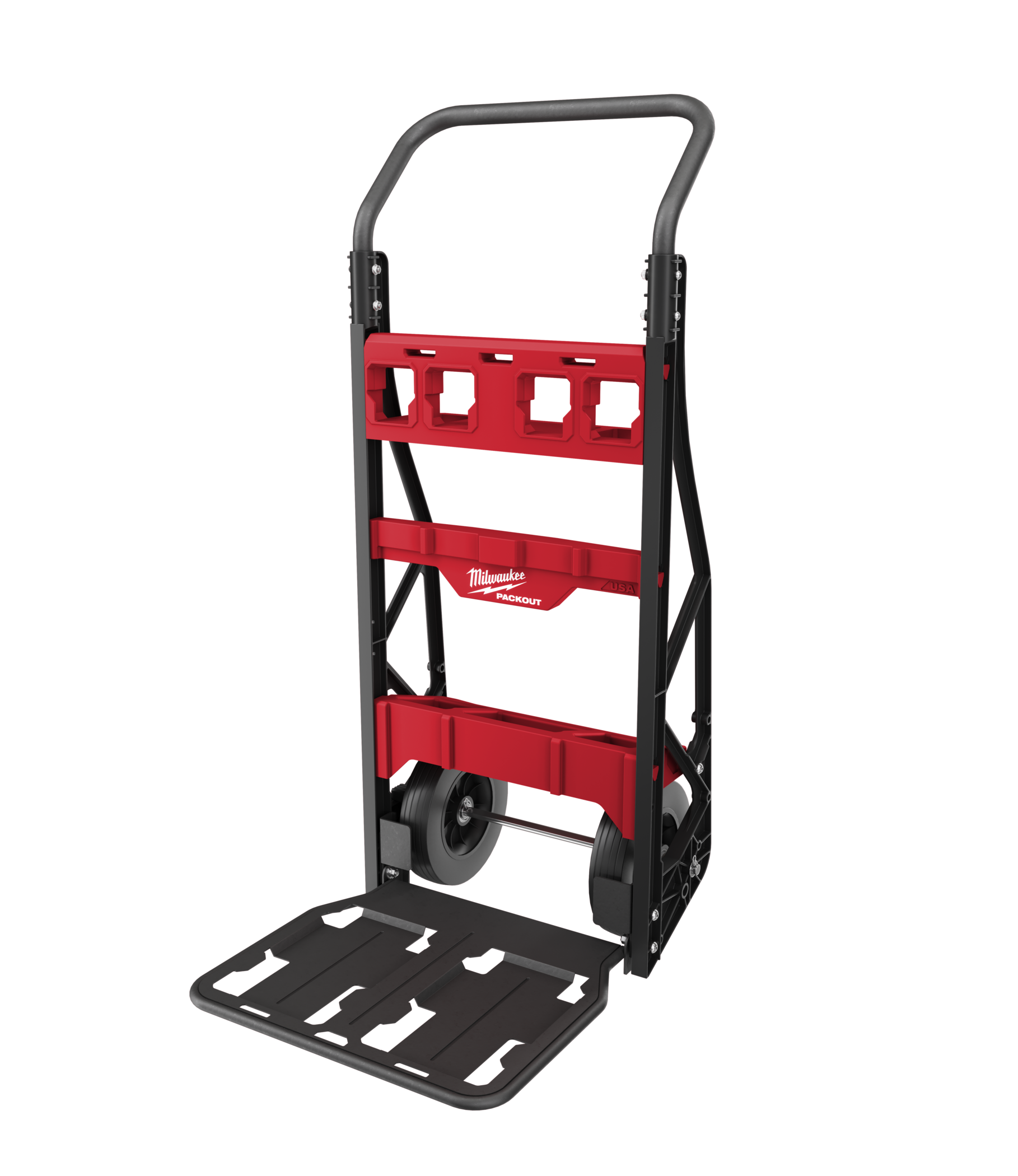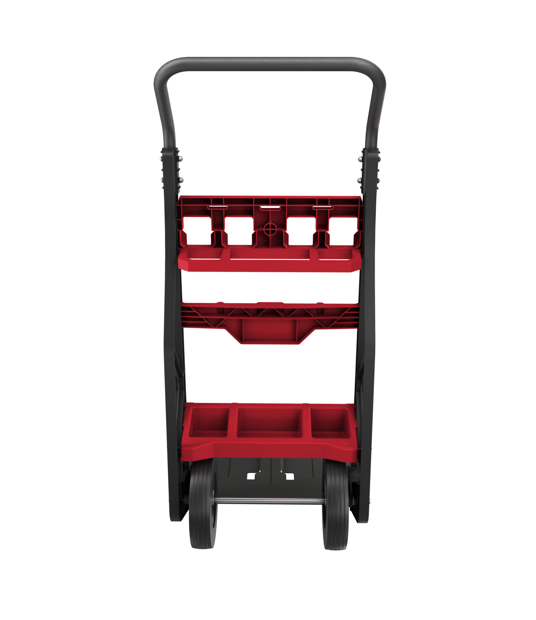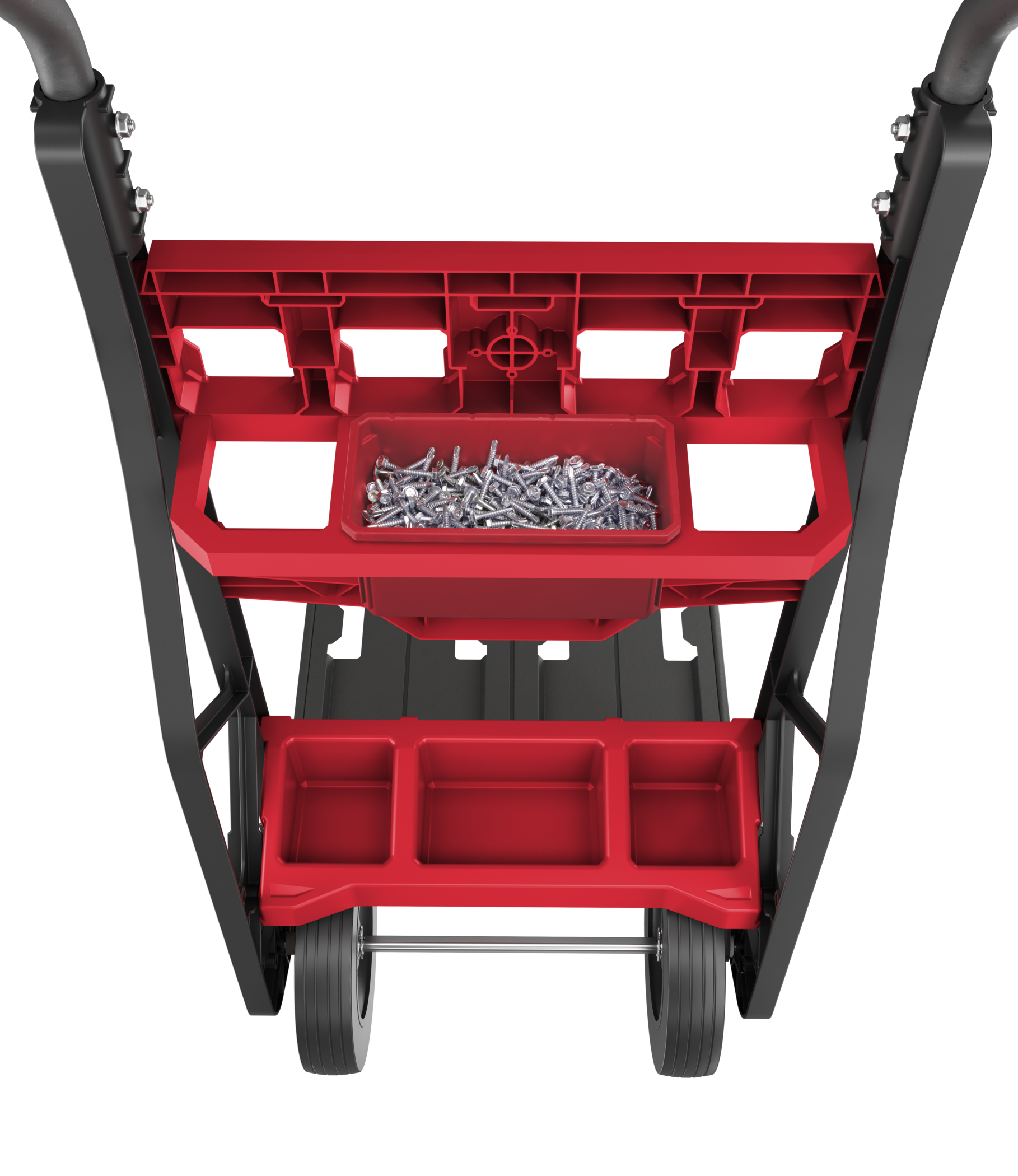 This PACKOUT™ 2-Wheel Cart has integrated PACKOUT™ mounting on the base and frame that allows you to securely stack or hang PACKOUT™ products.