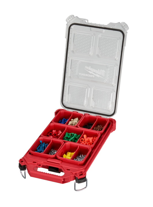 Our PACKOUT™ modular storage system is a durable and versatile storage system. The PACKOUT™ compact low-profile organiser is constructed with impact resistant materials so it can withstand harsh jobsite environments. An IP65 rated weather seal protects your tools, accessories, and small parts from rain and other jobsite debris. The small and shallow organiser's interior features 5 removable storage bins that with removable dividers. The transparent lid of the organiser seals the bins to prevent contents from migrating and shifting during transport. Heavy duty latches and reinforced hinges ensure that the slim and compact organiser keeps the contents contained and protected. Our PACKOUT™ modular storage allows you to customise and build your own storage system to easily transport and organise your tools and accessories.