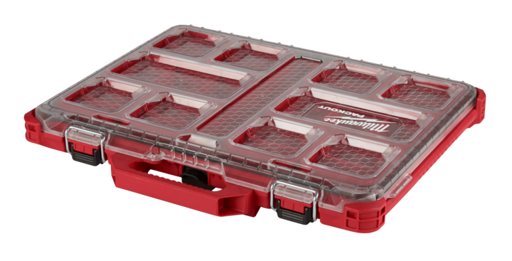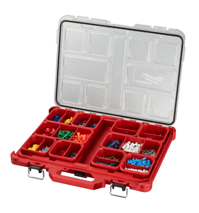 48228431 Our PACKOUTâ„¢ modular storage system is a durable and versatile storage system. The PACKOUTâ„¢ compact low-profile organiser is constructed with impact resistant materials so it can withstand harsh jobsite environments. An IP65 rated weather seal protects your tools, accessories, and small parts from rain and other jobsite debris. The small and shallow organiser's interior features 5 removable storage bins that with removable dividers. The transparent lid of the organiser seals the bins to prevent contents from migrating and shifting during transport. Heavy duty latches and reinforced hinges ensure that the slim and compact organiser keeps the contents contained and protected. Our PACKOUTâ„¢ modular storage allows you to customise and build your own storage system to easily transport and organise your tools and accessories.