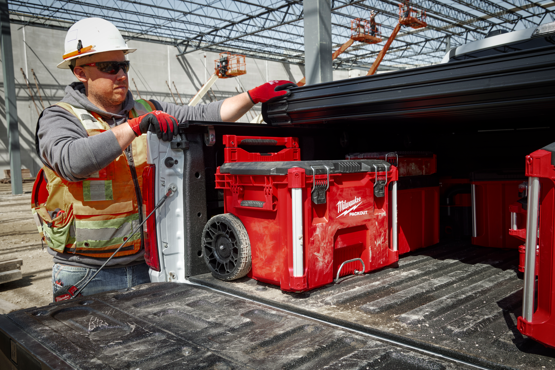 Our PACKOUT™ Rolling Tool Box features a 113kg (250lb) weight capacity, allowing you to transport tools and jobsite materials. A fully collapsible 50cm (19.75”) handle enables you to store your PACKOUT™ Rolling Tool Box underneath most full-size truck bed covers without removing the handle.