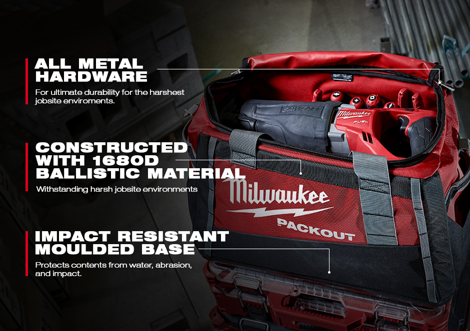 Our PACKOUT™ Modular Storage System is a durable and versatile storage system. The 500mm (20") PACKOUT™ tool bag features an impact-resistant molded base that connects with all other PACKOUT™ system components via integrated locking cleats. We constructed the durable tool duffel bag with 1680D ballistic material and all-metal hardware so it can withstand harsh jobsite environments. The 500mm (20") tool bag features open storage and two exterior pockets for your tools and accessories allowing easy access and visibility. We also added a cushioned shoulder strap, top handles and side handles allowing you to easily and comfortably transport your tool bag wherever you need it. Our PACKOUT™ modular storage allows you to customise and build your own storage system to easily transport and organise your tools and accessories.