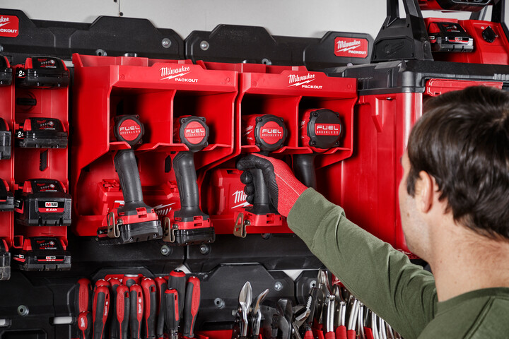 Our PACKOUT™ Tool Station delivers the most secure mounting when paired with PACKOUT™ Wall Plates. The Tool Station features quick access tool Slots and allows you maximise your space both in shop and in your household This Tool Station is optimised to store drills, impact wrenches, and more. In addition to the Tool Slots, the top shelf and bottom compartment can store chargers and accessories. Additionally, our Tool Station features connectivity with PACKOUT™ solutions allowing you to fully customise your shop.