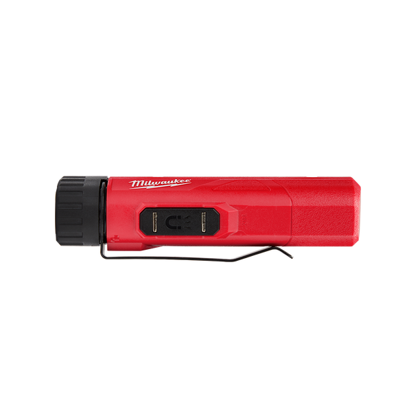 A built-in metal clip to attaches to your pockets or tool bags. The clip can also be used as a base and rotated to direct light when resting on a surface.