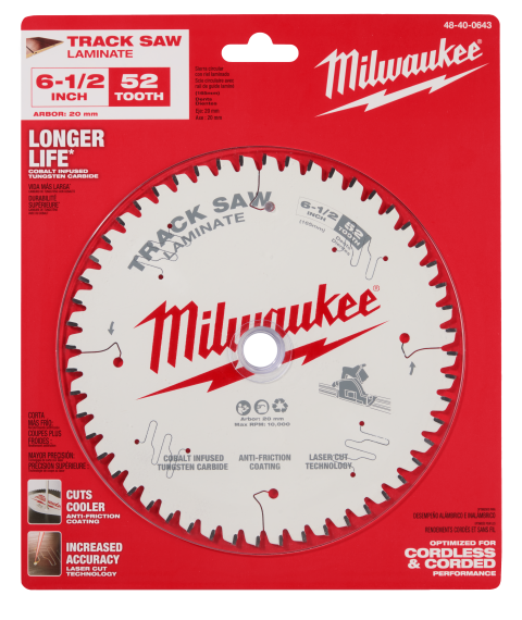 Milwaukee’s Track Saw Blades are designed to deliver accuracy and finish quality cuts in all Track Saw applications. The 52T Laminate blade with Triple Chip Grind (TCG) tooth design ensures smooth finish and longer life in harder materials like laminate flooring, laminated surfaces or aluminum and other non-ferrous metals.
