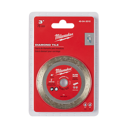 This is a 76mm Diamond Tile Blade intended to cut ceramic or porcelain tiles, either wet or dry, when partnered with the M12 FUEL™ 3” Compact Cut Off Tool M12FCOT-0. The 76mm blade diameter makes it easy for the user to maneuver the blade to make notch and rounded cuts to fit tiles as required.