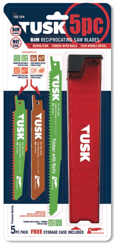 TUSK TOOLS have carefully selected 5 of their "must have" BI-METAL (BiM) reciprocating saw blade designs to cover you across a full range of material applications. Ideal set to keep on hand for any DIY or renovation situations. TUSKs multi-material blade designs will cut both wood and metal - and as such, are the perfect tool for the job becasue they can deal with a variety of materials without the need to change out blades. BiM construction adds flexibility, breakage & heat resistance, hardness and durability. Teeth made from M42 grade steel for maximum performance, longer life, versatility, and toughness even with METAL applications such as thin sheet metal, middle metal plates, profiles and pipes.