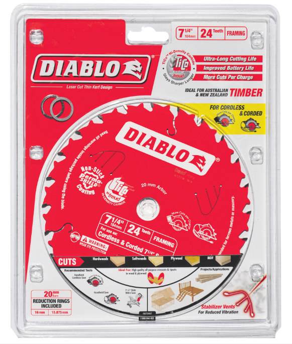 Diablo's next generation 7-1/4" 24T Framing Cordless Blade delivers maximum life and durability with Hi-Density carbide with Titanium & Cobalt blend for effortless cutting performance. The super thin kerf design allows unmatched cutting efficiency meaning more cuts per battery charge. This blade has 5 times the cutting life of a standard circular saw blade.