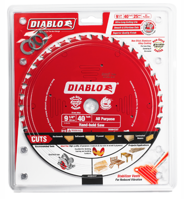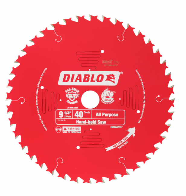 Diablo's general purpose blade is ideal for cutting oak, pine, plywood, pressure treated lumber and beams. An excellent choice hand held saws, Diablo's blade leaves a smooth cut in a variety of applications, reducing the need to change blades between tasks. Use it for ripcuts with a smoother finish than dedicated ripping blades, or make quality crosscuts in solid wood or plywood. Excellent for trim work and building, bookcases, cabinets, shelving, etc