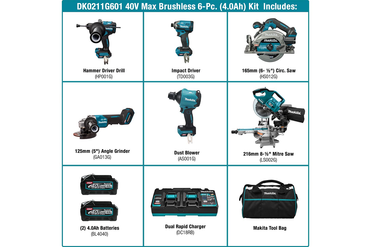 XGT 6pc 40V Brushless Kit includes: