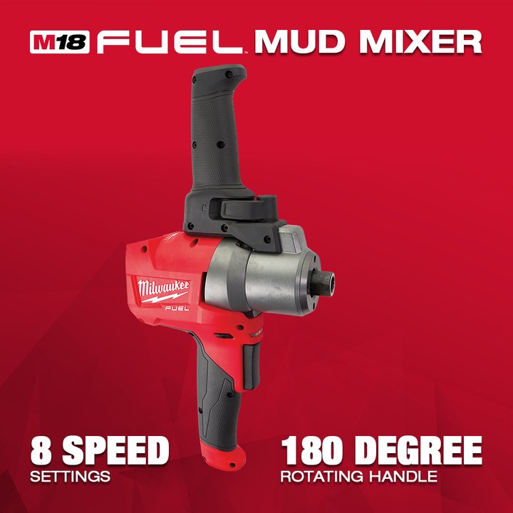 The M18 FUEL™ Mud Mixer is the industry’s first dedicated cordless solution that delivers the performance and durability to fully replace corded mixers. With the POWERSTATE™ Brushless motor it has the power to mix heavy compounds, such as concrete and mortar. Using our REDLINK™ intelligence the variable speed dial, the variable speed trigger and the lock on button combine to give the user ultimate control for a consistent mix and cleaner working environment. With the M18 REDLITHIUM-ION™ battery, the user can mix up to 15 buckets on one 5.0Ah battery. The 180° adjustable handle is designed to allow every user to optimise the handle position for their comfort. This Milwaukee cordless solution increases productivity by eliminating the need for cords and allows the user to mix the material at the workspace where it is being applied.