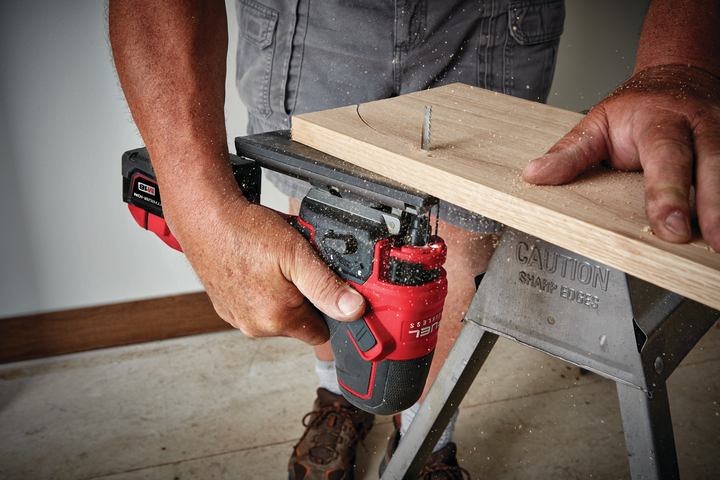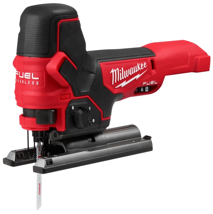 The M18 FUEL Barrel Grip Jigsaw combines power, blade speed and precision, to provide the highest quality cuts in a wide variety of materials. The M18 FUEL Barrel Grip Jigsaw leverages the POWERSTATE Brushless Motor and REDLINK PLUS Intelligence to provide higher blade speed than corded jigsaws at 3500 strokes per minute for clean controlled cuts with minimised chipping or bucking. Leveraging the M18 REDLITHIUM-ION 5.0Ah battery the M18 FUEL Barrel Grip Jigsaw provides up to 32m of cutting in 19mm laminated particle board, delivering all day productivity with less trips to the charger. The saw features tool-less blade change, tool free bevel adjust with detents at 0°; 15°; 30°; and 45° as well as an LED light and on/off blower to keep the cut line visible while cutting